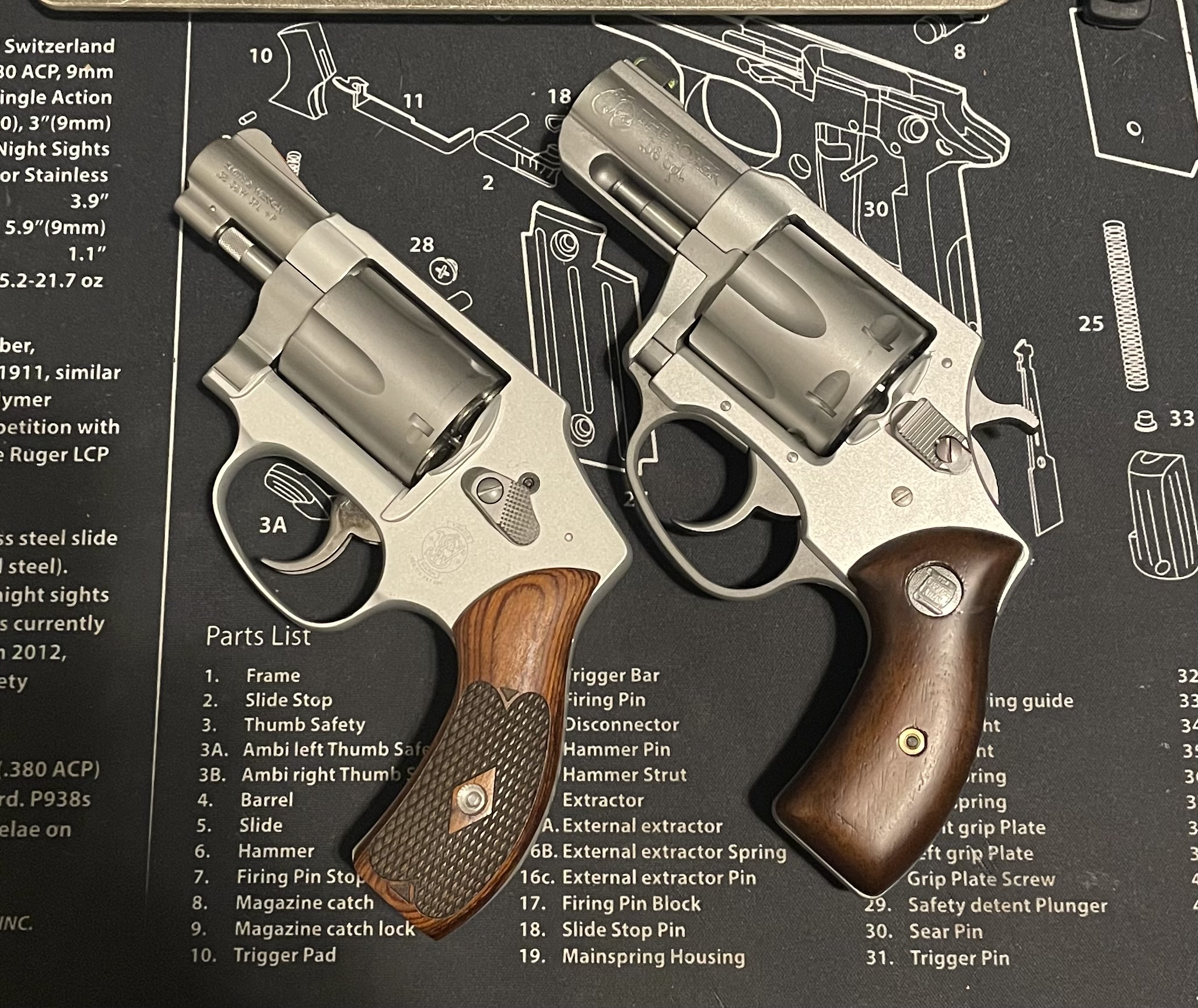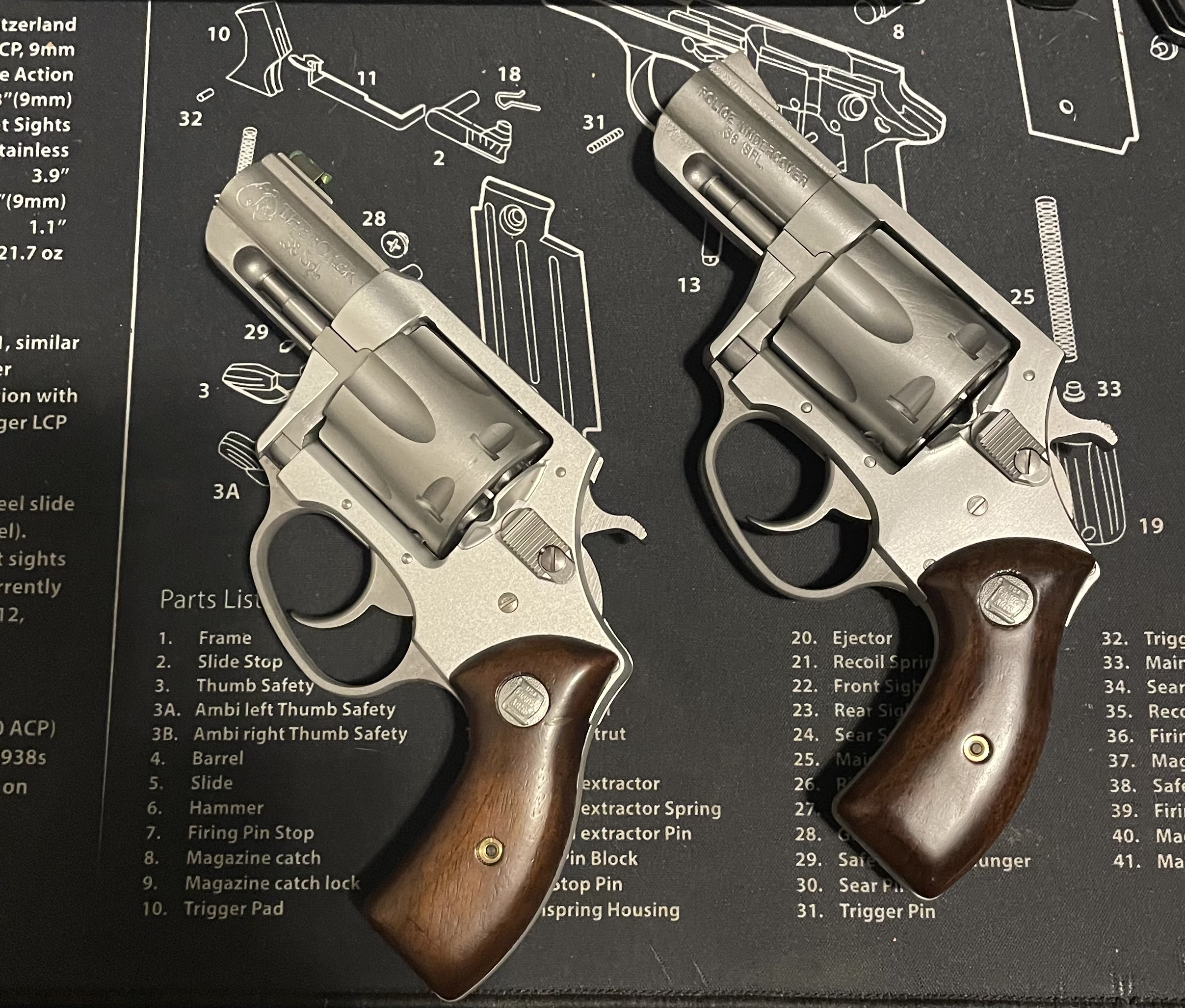 I took a chance on the Charter Arms .38 Specials because they hold 6 rounds in a J-Frame size package, and they are made in the USA by an American company. I have the aluminum-frame Boxer, which comes with a green fiber-optic front sight, and the traditional Police Undercover. I have one photo showing a size comparison between a J-Frame and a Charter. As you can see, I like slim wooden grips. I added them to each of these guns, but the Charter Arms grips were significantly more affordable because they are sold on Charter's website for $19.99.