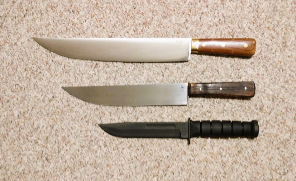 I tried to take a picture of a couple bowies I have to show what they were believed to look like. The top one is a copy of the Edwin Forrest bowie, believed to have been given to the actor by Bowie himself, it is a Bark River knife. The middle one is a copy of the Sandbar knife I had made for me by Scott Powers who was a Forged in Fire winner. The bottom one is obviously a KaBar that I placed in the photo just as a size reference.