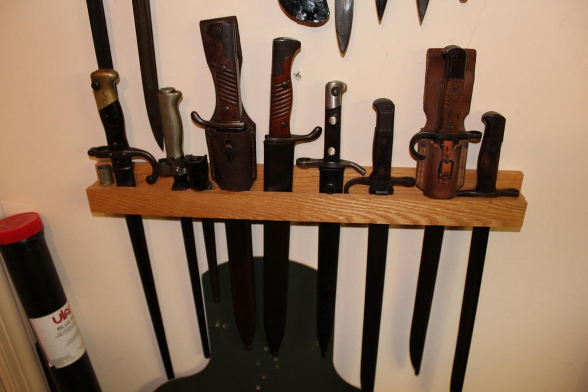 If you look at the second picture the 2 bayonets with similar wooden grips would be appropriate for most of the German rifles from the WWI. One is the butcher blade model and the other is called a saw back bayonet. It has saw teeth opposite the blade. These were issued to Pioneer units and they used them to cut brush. However, when used in combat they were known to give a really nasty wound. It's said that the British would execute Germans prisoners on the spot who had these. The five on the right hand side of the first picture are German bayonets used in the WWII. I have been collecting bayonets for over 50 years. Gun shows used to have boxes of them that you could pick through. Several I even bought at yard sales.