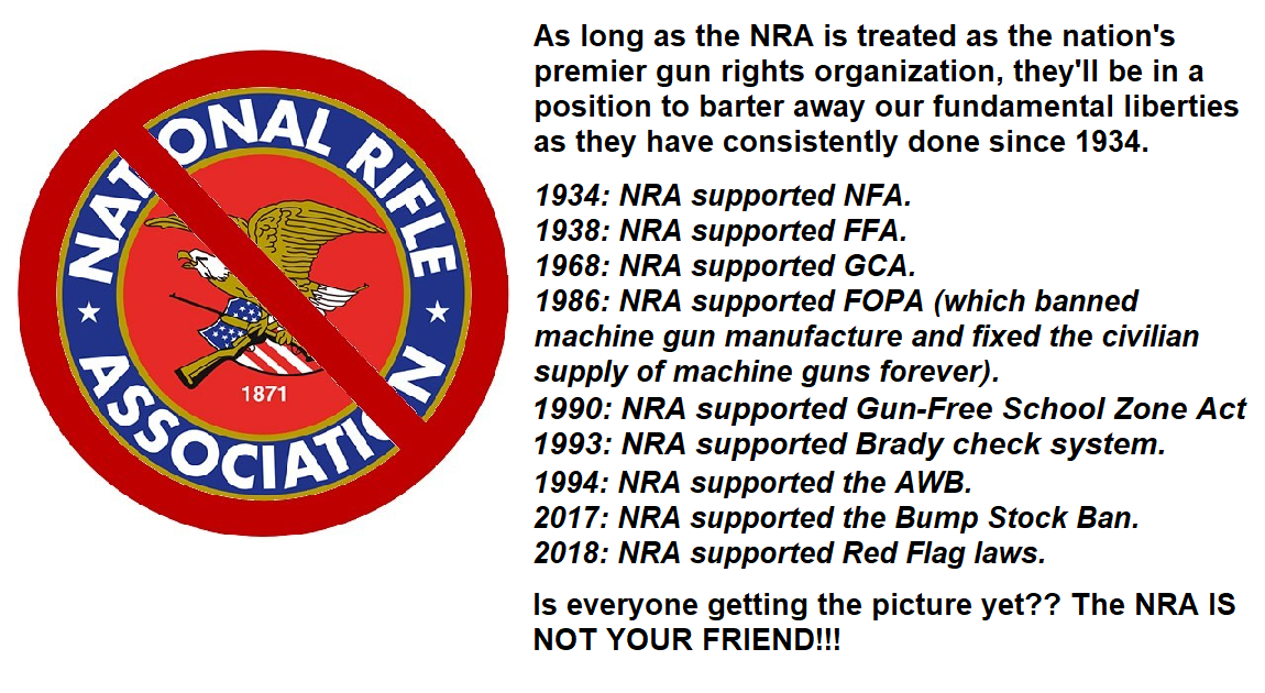 In a way, antigun, anti-2A MSM hit pieces on the NRA are actually doing the 2A activist community an unintended favor. It's waking up gun owners to the shenanigans at NRA HQ, enraging them and causing them to abandon the NRA for REAL Pro-2A GROUPS like GOA & FPC. When people stop regarding the NRA as the nation's premier gun rights org, the NRA will no longer have the ability to sell us down the river and betray our freedom as they've been consistently doing since 1934.