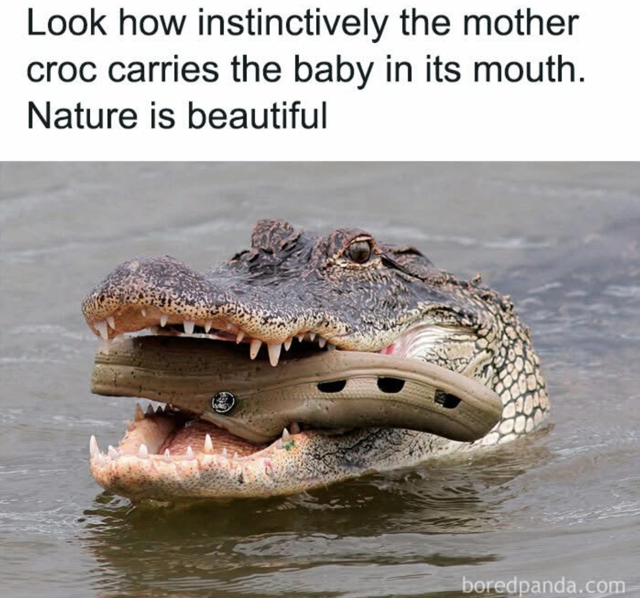 I'm inclined to think more that mother alligator is considering maybe having that baby croc for lunch ... until she realizes it's a little tough and rubbery.