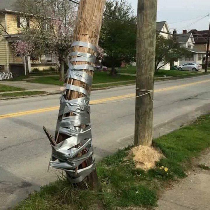 You silly man ! The rope is to keep the broken pole from falling the other direction.I get the duct tape but what's that rope going to do?