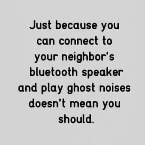 This one hit me hard i could hardly tap this post i've been laughing so much... the apartment i was in is dormitory style and almost every "neighbor" didn't change their bluetooth passwords or never used one so i would ask one of my people to use their music/streaming things so i/we could play my choice of music or sounds... i am a certain "heavy metal" and music fan, that most people never heard of or care to listen to. And we didn't need to leave that apartment to get better reception...