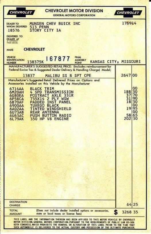 Admittedly I've been out of the game for a very long time, and there was a time I could tell you the name of every model made by Chevy, every spec of every engine ... big block/small block, displacement w/bore and stroke, rated and actual horse power, every available transmission w/final drive ration, and even the rear gear ratios available with whatever combination. But for the life of me could not remember a 3.31 rear gear ratio. Thought maybe that invoice was for a build that had been a holdover from a model Chevy brought back as an Australian Holden car and the paper work had just not caught up with sales. Did a lot of research of RPO's and other info to find it but finally did, although I couldn't find it for '65. So yeh, it was made and available in that year in certain models of Malibu, Chevelle, and Nova's. Damn I hate this 'gettin' old' crap so I think I'll ask those who might know ... Hey Old_Me and papa, one of y'all should probably know. Does it continue to get worse, or is there a number where it kinda' smooths out? LOL! LOLfrom 1965.....
