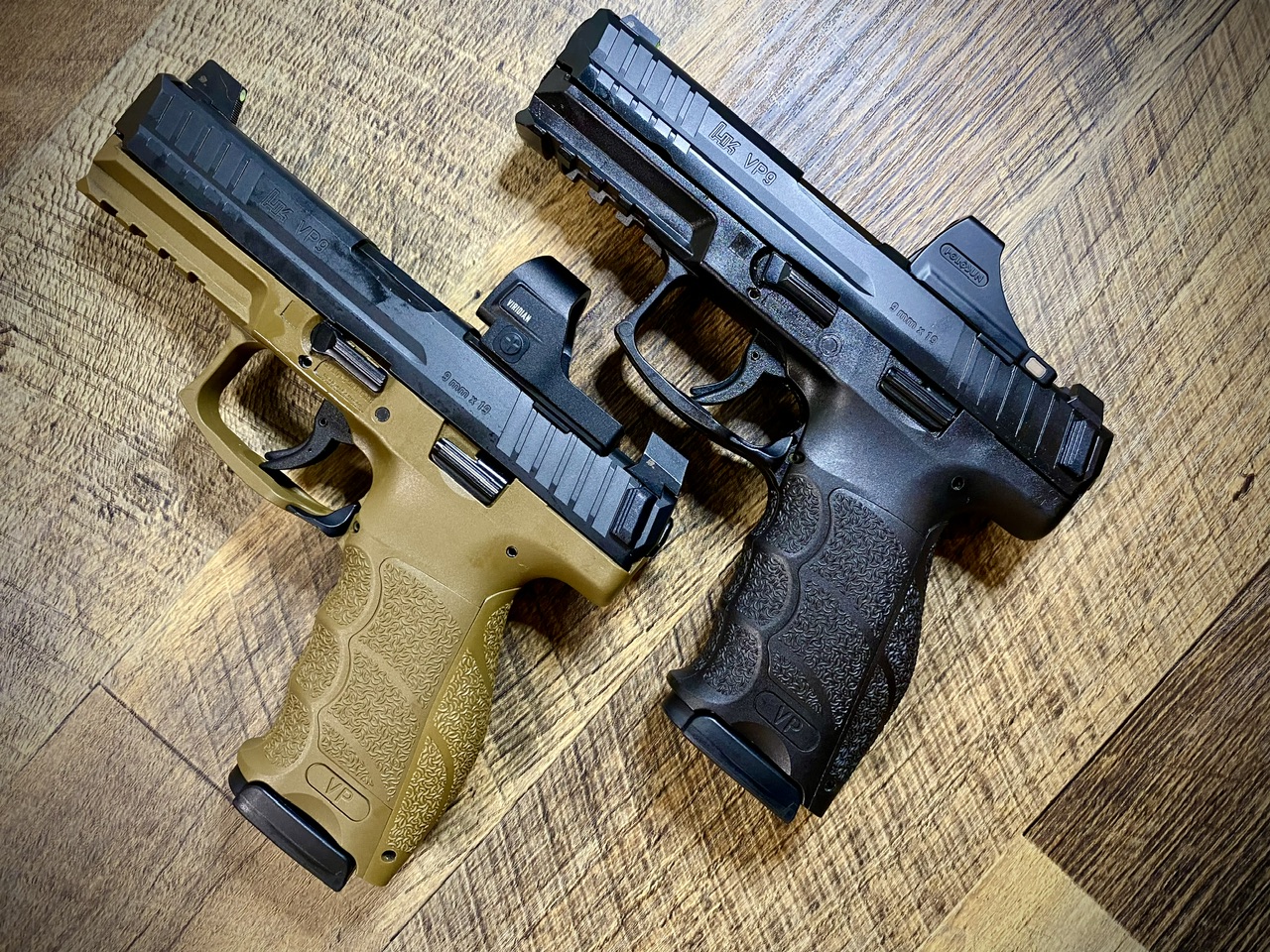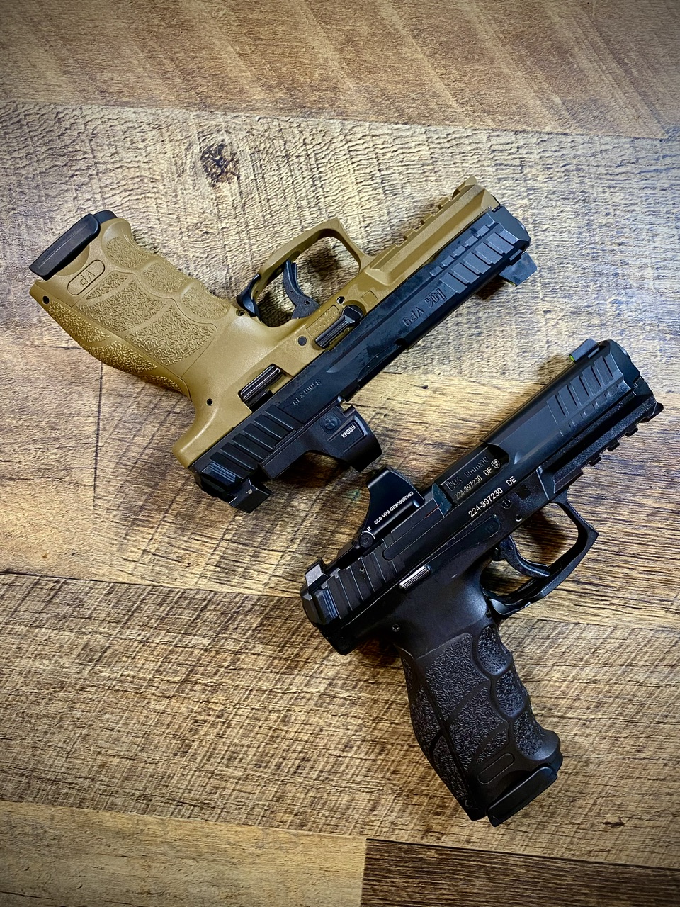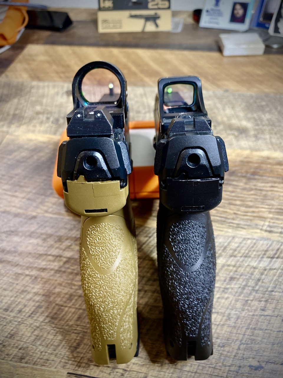 I couldn’t position the guns to show the dot on both sights, but you can see the difference in sight windows.