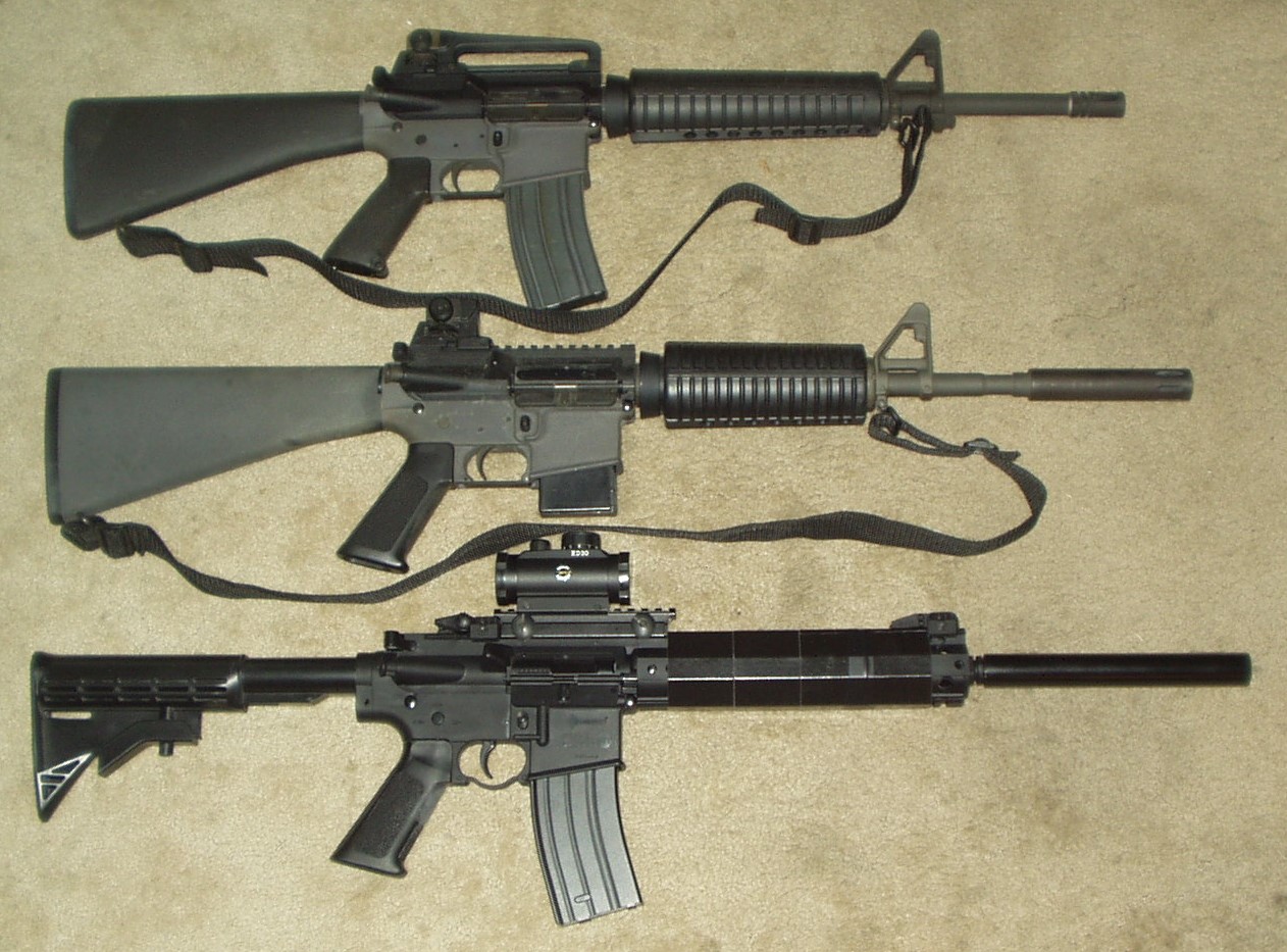 Faux Dissipator: top mid length 16inch, 2nd is a standard 20-inch rifle length pencil, bottom is a true dissipator with a rifle length system on a 16in HBAR
