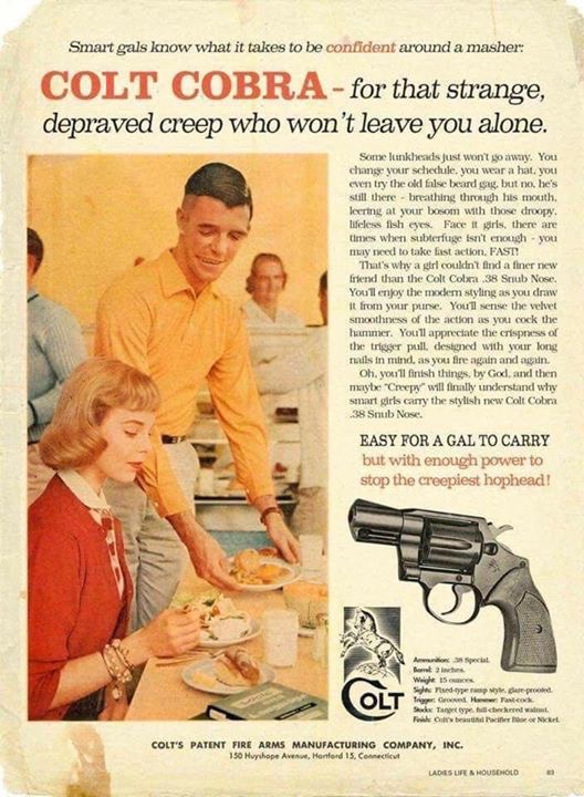 A vintage women's magazine advertisement for a Colt Cobra revolver for use against 'that strange, depraved creep who won't leave you alone' is a recent fabrication.www.snopes.com