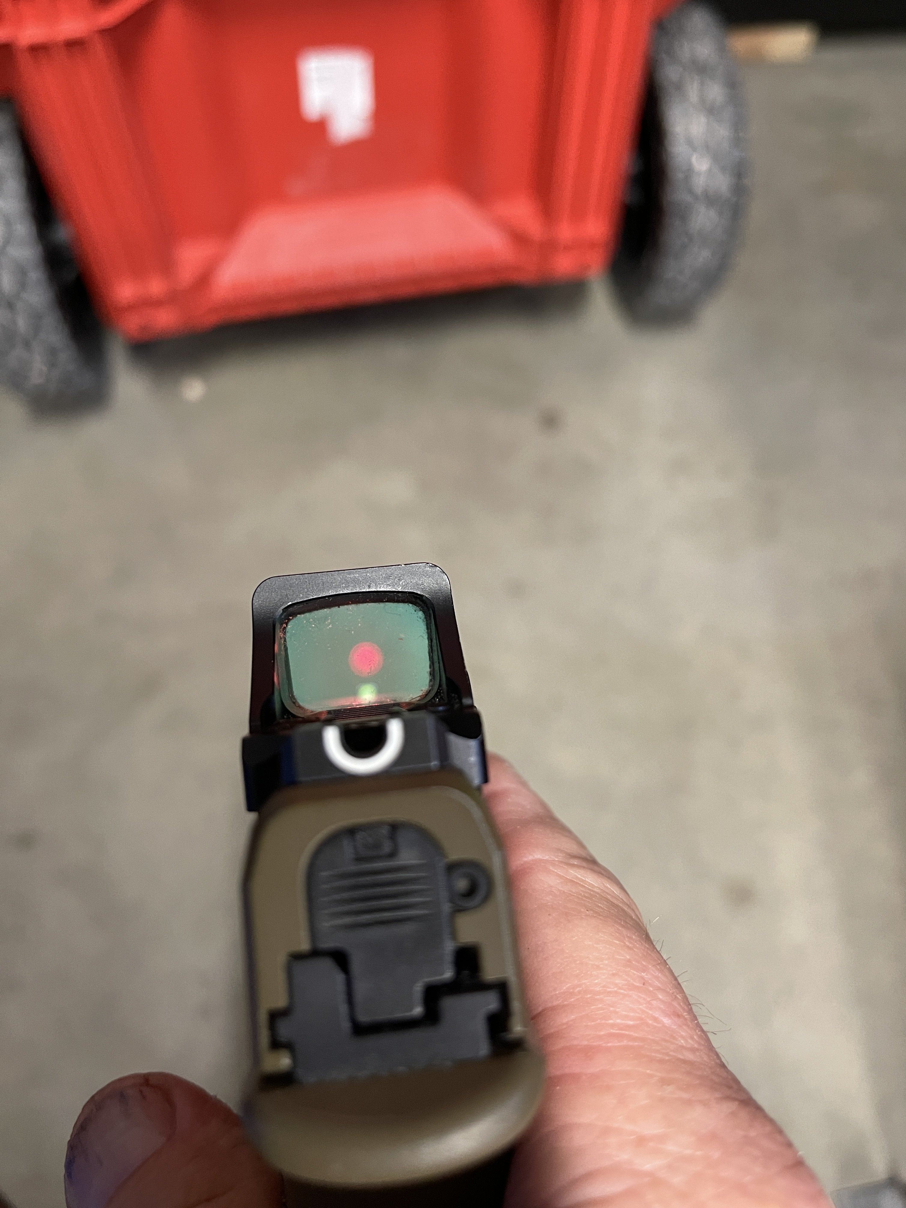 Maybe I wrote that wrong but I didn’t think / don’t think I have 100% co-witness. I can barely see my irons and the dot at the same time. As far as not being lined up, that was me trying to hold the phone while pushing the focus button and my hand slipped (more than once).With all due respect there Inspecta ..... true 100% co-witness is when you can see the irons correctly, as in a full sight alignment/picture along with the RDS. In your first picture the sight alignment is way off ..... actually in both pictures that show the dot they are off. In both pictures that show the dot, assuming the irons are aligned, the POI would be way high and to the right.