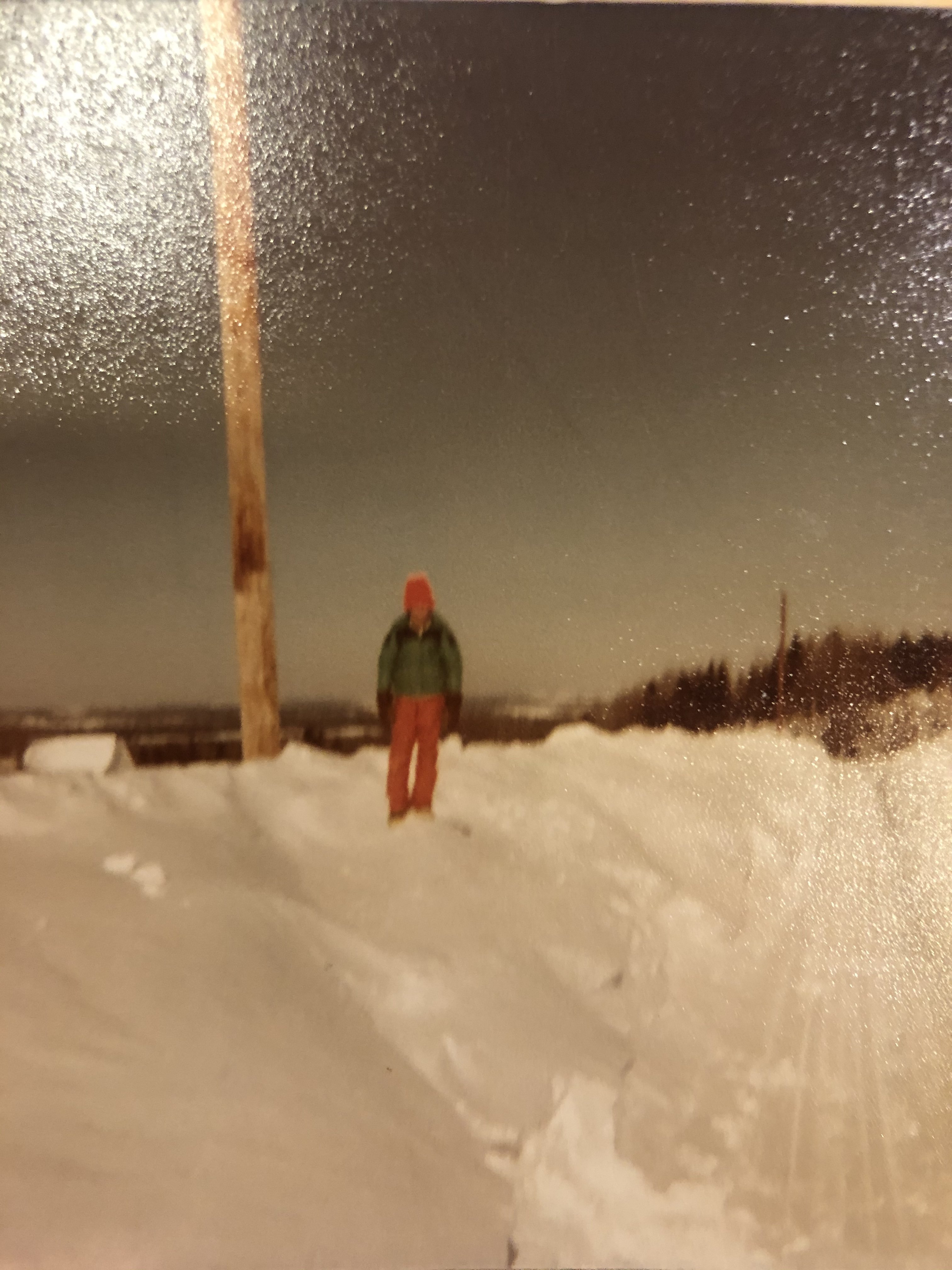 Look how high up the telephone pole the snow is . Dad hired a Front End Loader to clear the driveway. Our snowplow wouldnt keep up