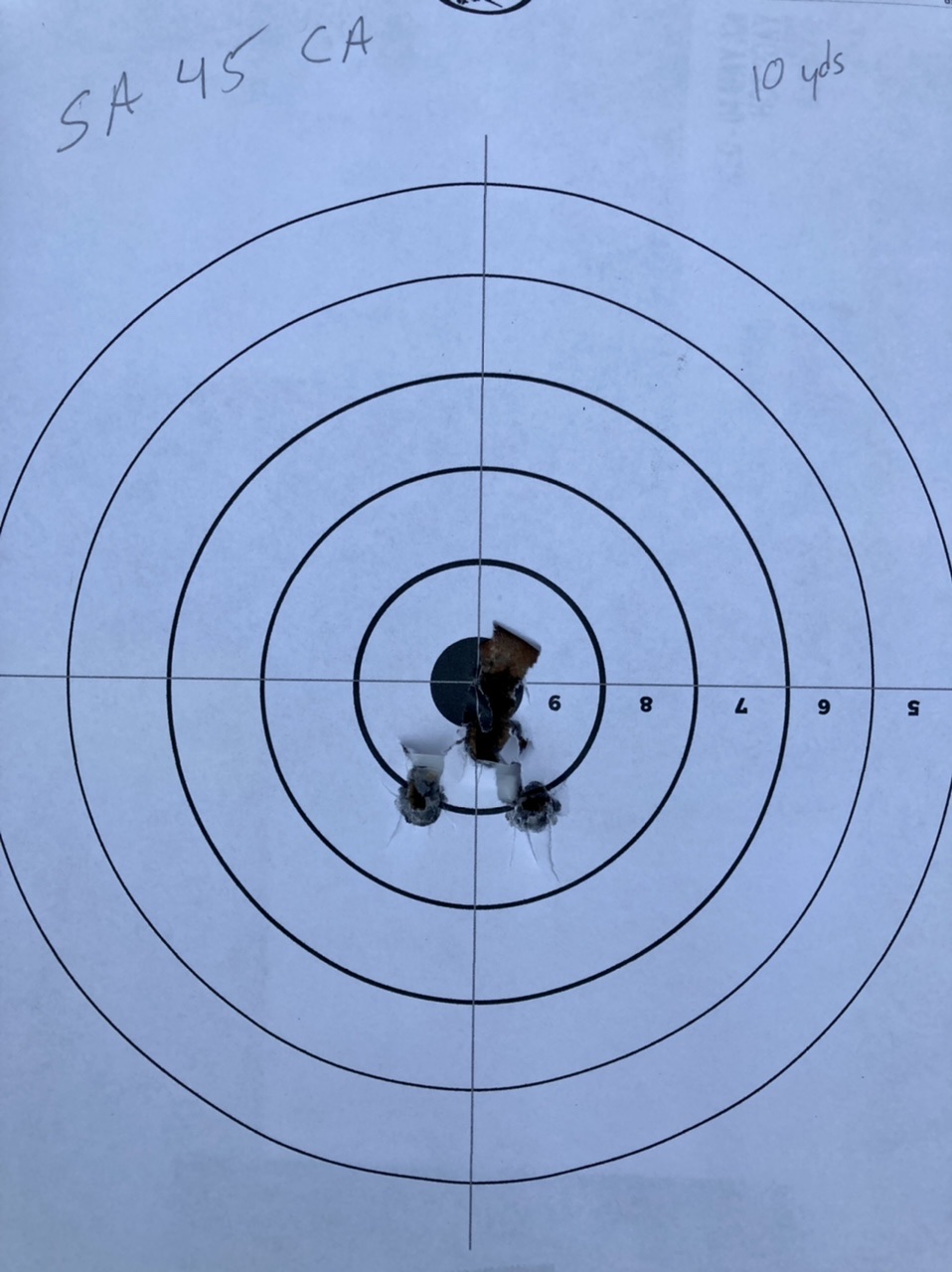 ) Below is the target at 10 yards, grouping at a pretty darn good 5 shot group of 1.25”. This was 1 of 2 guns that actually hit the bullseye.