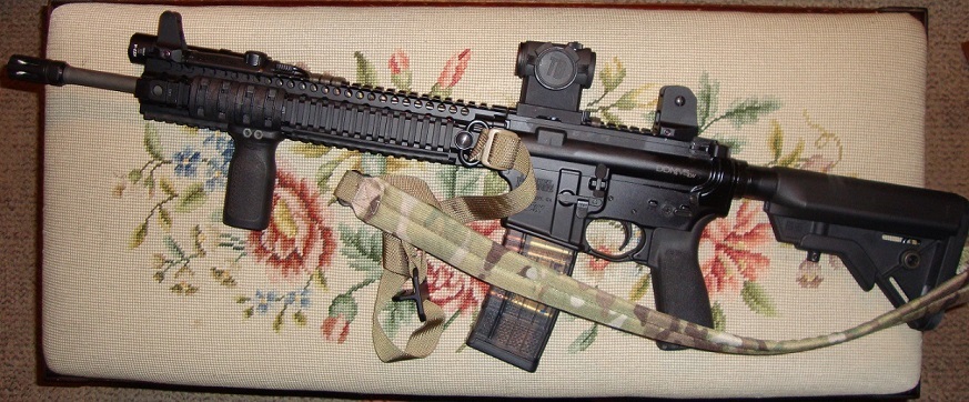 My range/training beater - nothing special, just a BCM upper (16" ELW BHF w/15" KMR....this was in the era before the -A variant: I specifically went this way for weight considerations - I'm not that big up top, and I like to take training classes, so I wanted a gun that I didn't have to deadlift on every "Up" drill