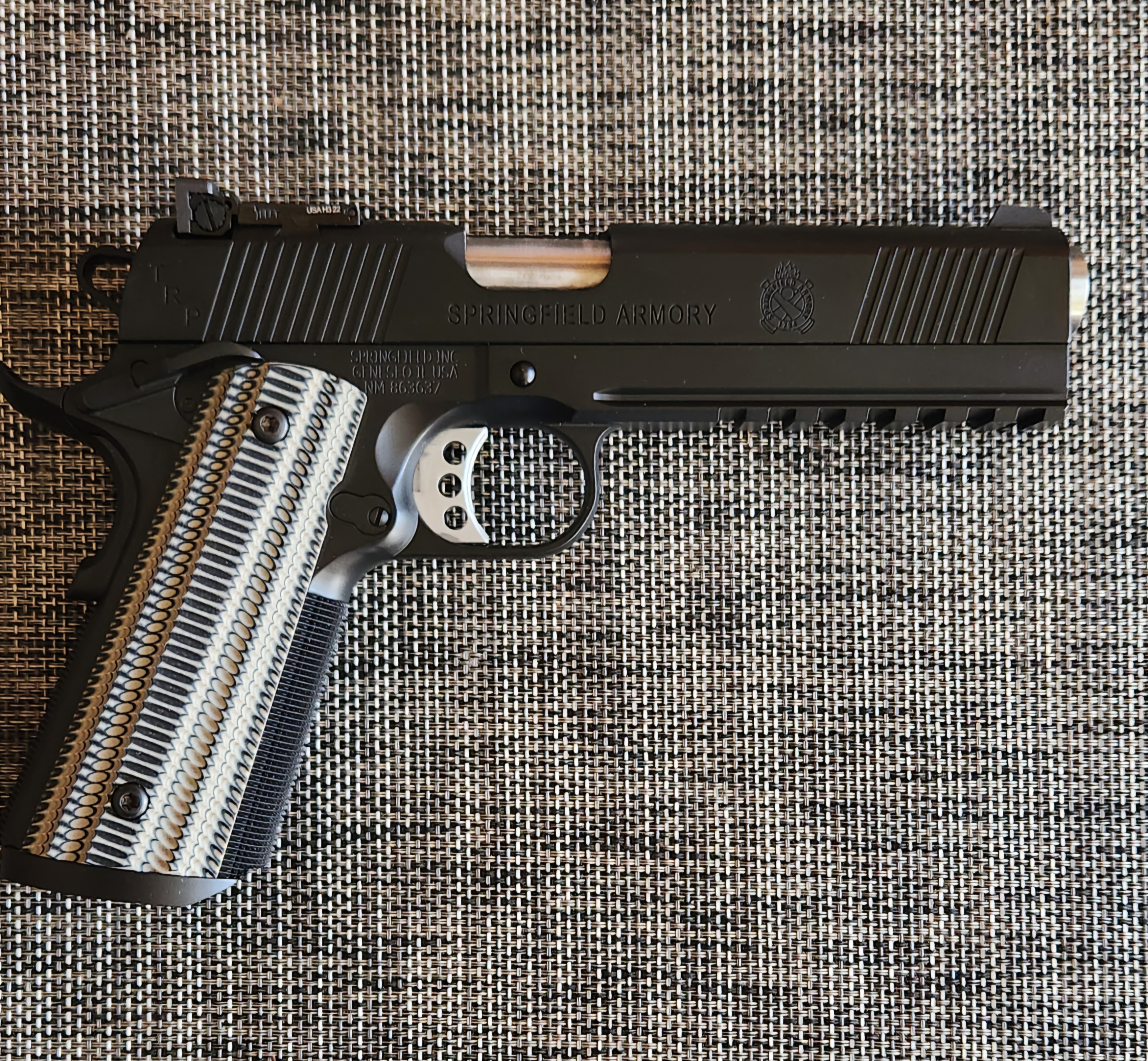 Got some top focals from SSP for the range. They help.This pistol stated as a stock Springfield Armory Mil-Spec 1911 45 ACP. Nighthawk Customs did the work using Harrison Design Retro Custom parts. It looks Smooth and Elegant