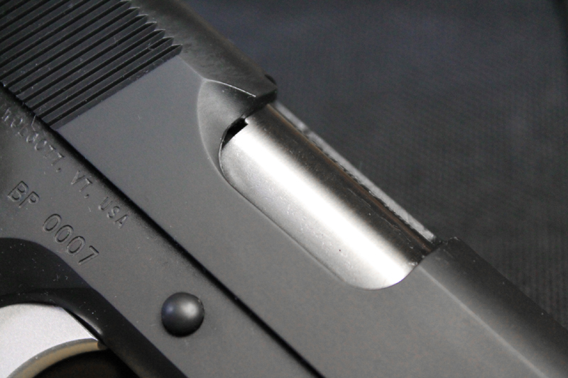I found that if when putting the slide stop back in-with the pistol cocked flip the safety up and install the stop part way just enough to get past the initial start-then flip the safety back down and finish the slide stop-