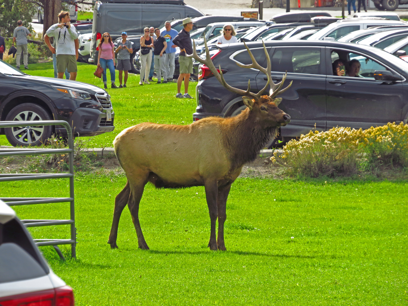 Lots of crowds…We were lucky enough to catch the end of a disagreement between two elk bulls over whose girlfriends were whose in Mammoth Springs in Yellowstone NP. There was more bugling than sparing. Neither seemed to want make a serious challenge. They finally broke off and went their separate ways. One crossed the street to our side so I was able to get a few good pictures of him before he chased his girlfriends back into the hills.