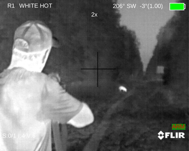 This is some pics of my thermal. You can see built in crosshair that is adjustable to color and style. The pic with the man standing is my buddy using my thermal and my second thermal is in my hand as a “scout” optic not on a gun.