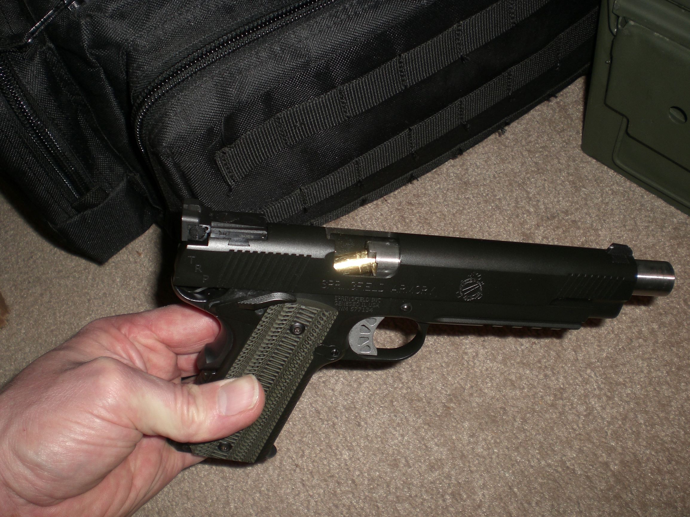 I just purchased the Operator 6" 10mm. It's sad it doesn't have a full length guide rod, I thought that was standard with the TRP series. The worst part, is that the gun was jamming all the time ( failure to completely feed a round into the chamber) and was shooting really far to the left at only 15 yds.. I sent this gun back to them and they didn't even try to fix it, they just sent me a new gun. ... They didn't know that isn't allowed to do in New Jersey with out a permit. ... The 2nd gun did the same thing! So back it went. Springfield somewhat corrected this problem (but not totally) by radius, blending and polishing the throat and feed ramp into the chamber. The 2nd gun still shoots to the left, but not as much. As you can see by the photos, the rear sight shouldn't be hanging off the right side of the slide that much on a $1800 gun in my opinion. ( My Springfield custom carry 45acp. has fixed sights centered on the slide and shoots straight). The 10mm holds tight groups, there just off to the left. Has anybody else had a similar experience?