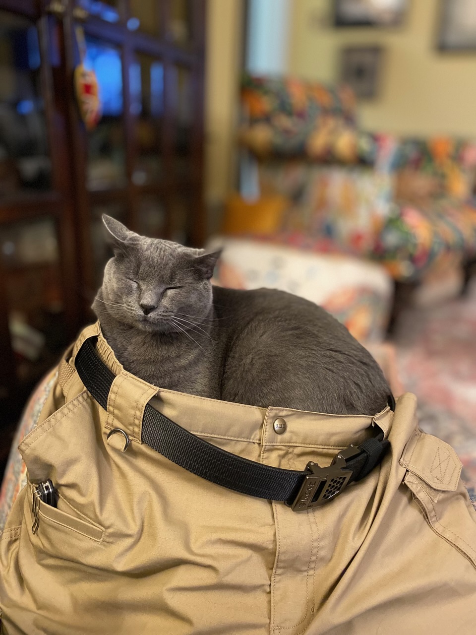Looks like a cop to me. Napping on the job. I think I see some doughnut crumbs on the wasteband of his cop pants too.Mine do. Maybe because they get treated like they’re our kids! I’d like to come back in another life as one of my cats. One of them even has his own gun belt. Kore and his own 5.11 shorts. He doesn’t look like a cop in his 5.11 gear! And he’s got a Spyderco Ikuchi. That kid’s definitely got his Dad’s expensive taste.