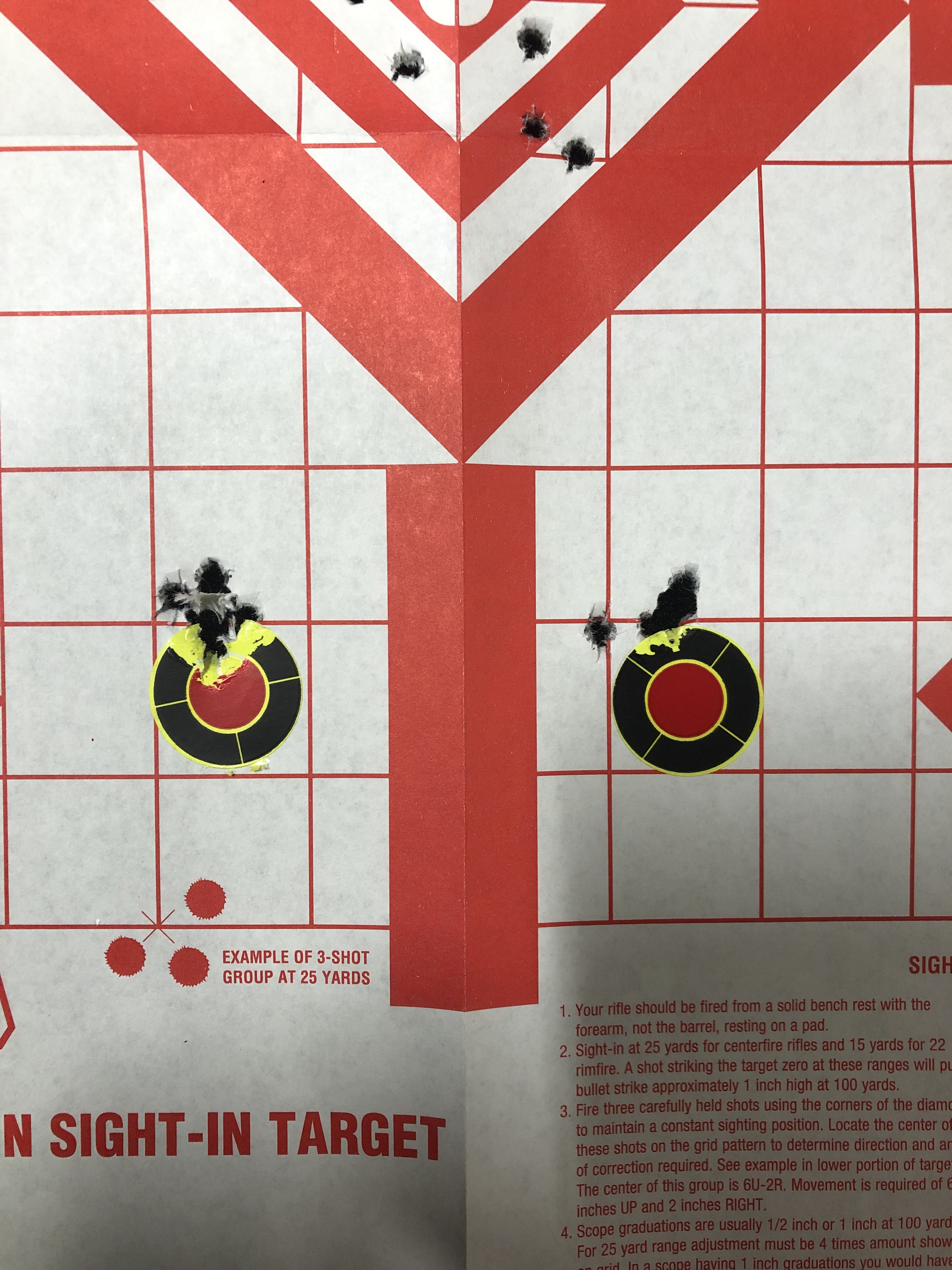 The old girl shoots pretty good and i’m sure with younger eyes and someone with better skills this would be quite a tack driver. This is two 5-shot groups at 25 yds using CCI SV ammo and the factory peep sight.