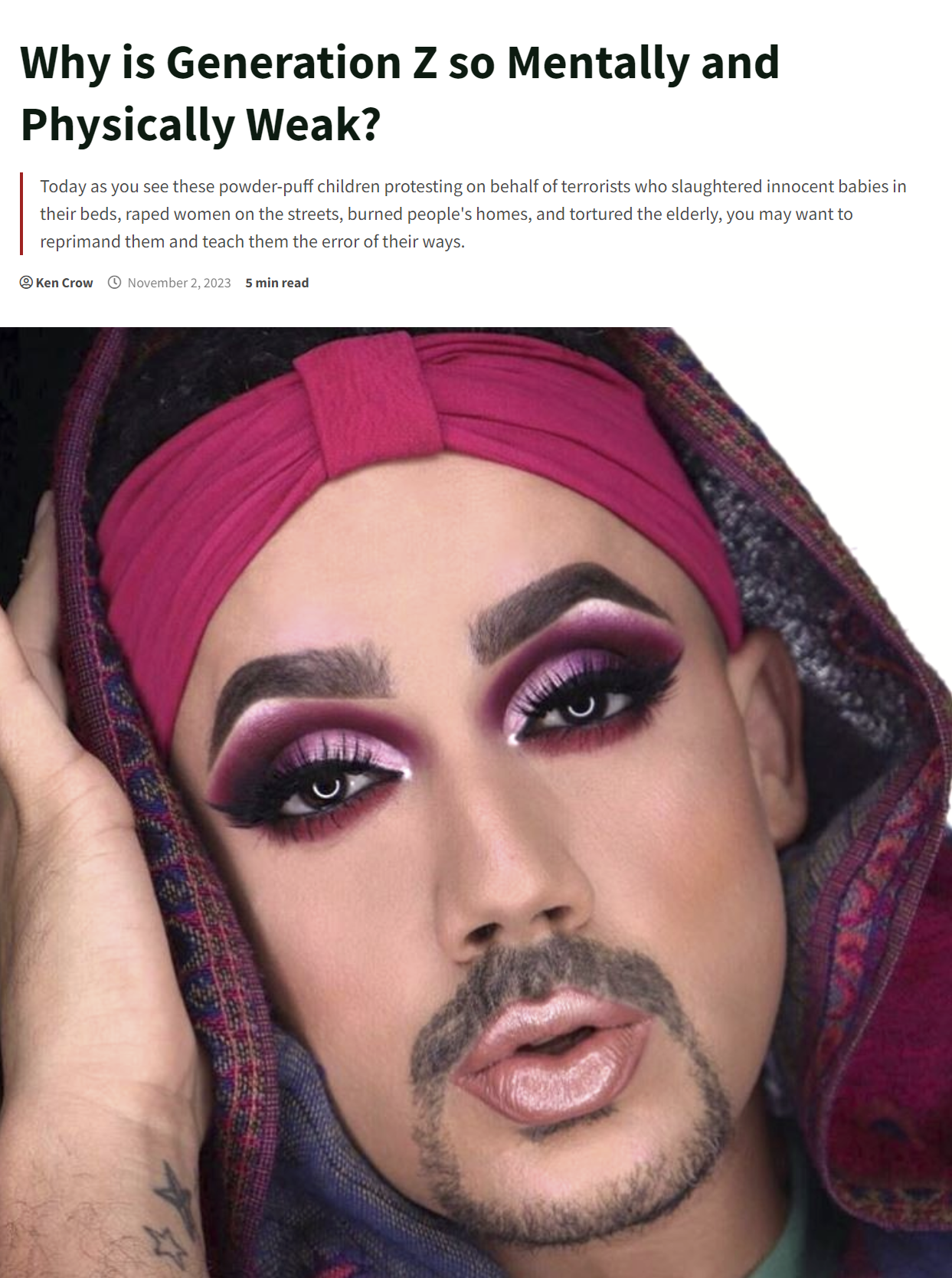 I'm not ashamed to admit I am OLD SCHOOL. Don't know if this person is a he or she. Definitely would not want them in any unit I was assigned to. I don't really think this person would show up looking like this at a recruiters station. But under all the makeup it would still be a Gen Z. No hate mail please.