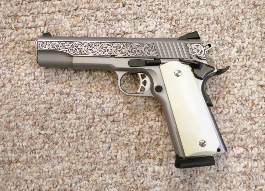 Beautiful. I’m not into engraved 1911’s much, but something about this one I really like. Amazing 1911 sir.Well I posted a photo of my "House gun" a week or so ago (10 yr old stainless Mil Spec) but since I saw this thread was back up I dug my SR1911 out of the safe. I used to carry this some but wanted to rid myself of the laser etched billboard so I got it engraved. Now I don't shoot it or carry it. It just lives in the safe, so I got it out to take it's picture.
