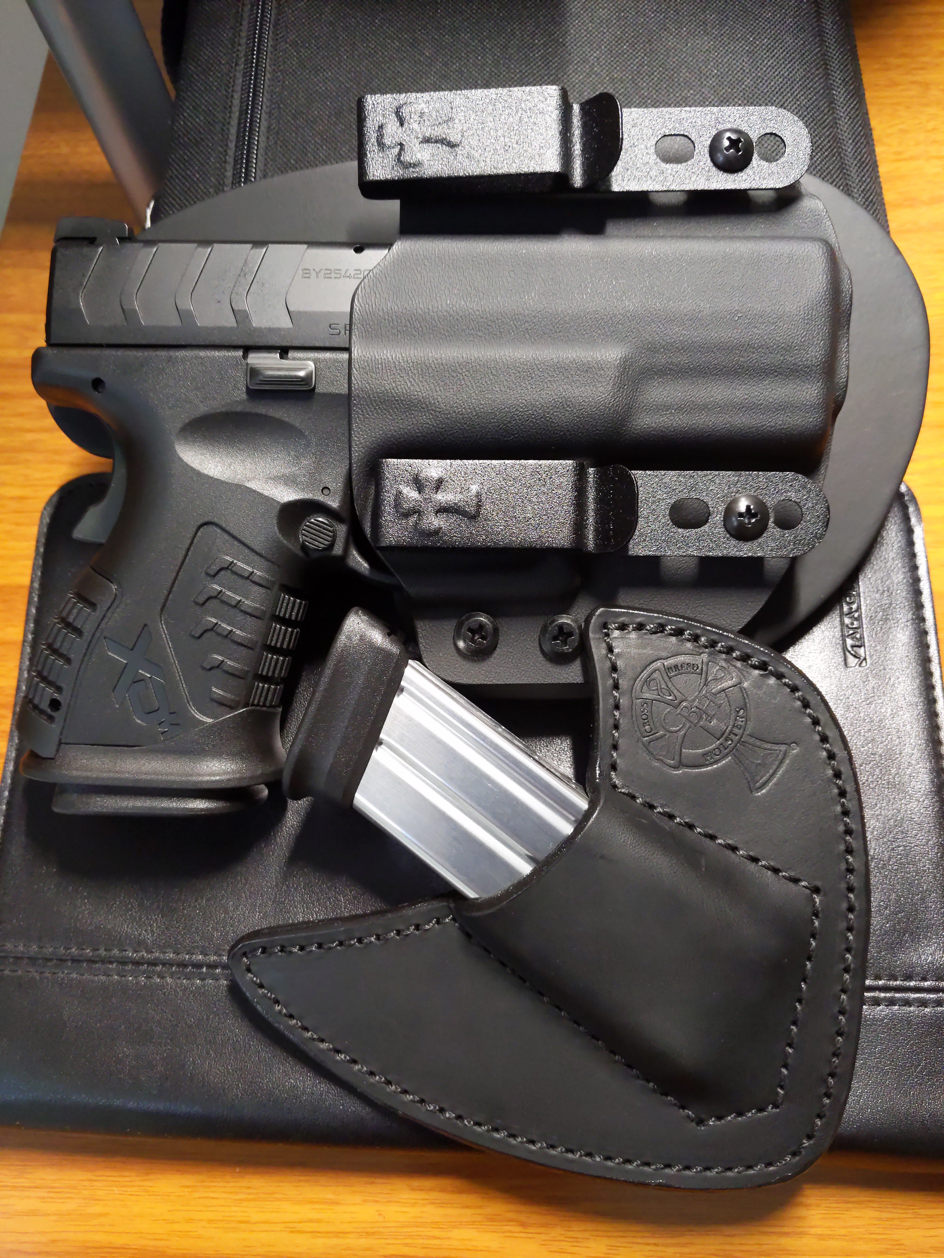New additions to my EDC. I switched from the XD-S Mod.2 to the XD-M Elite 3.8 Compact, because I realized that the grip was just too small for me. I went with cowhide this time for my holster and mag carrier, because the horsehide was really stiff.
