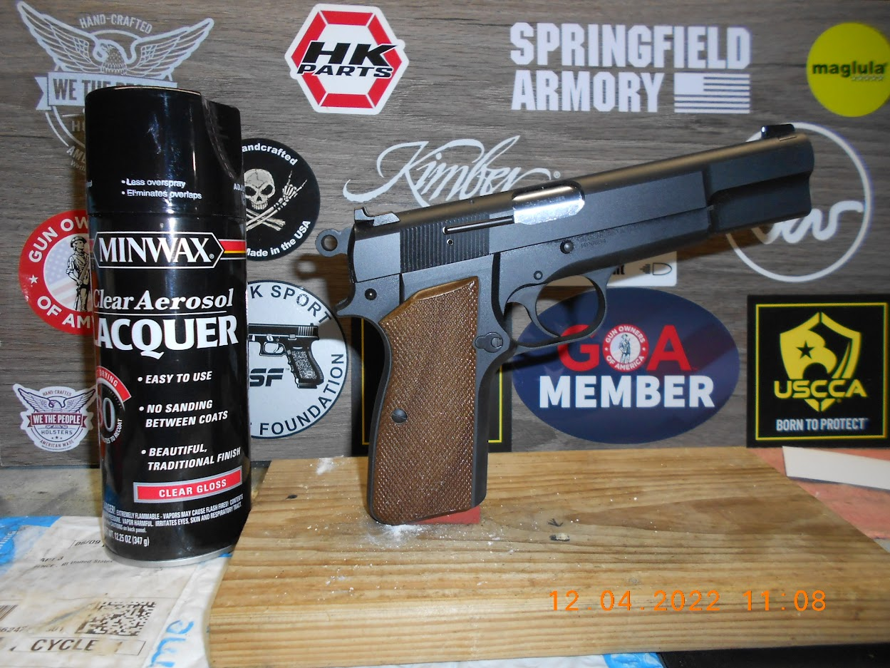 After another range day cleaning session I grabbed an old can of high gloss lacquer and gave the grips a "spit shine". I think it added a nice touch to it.
