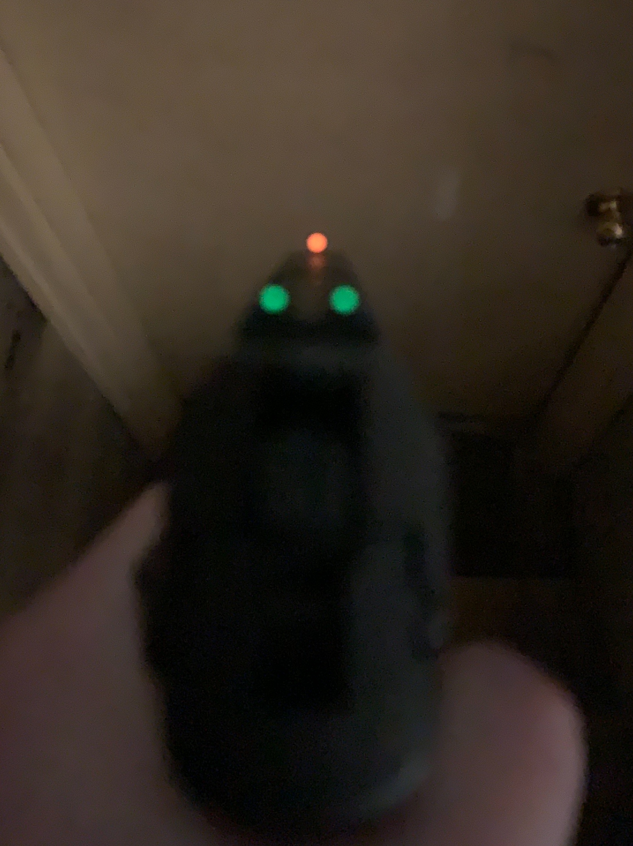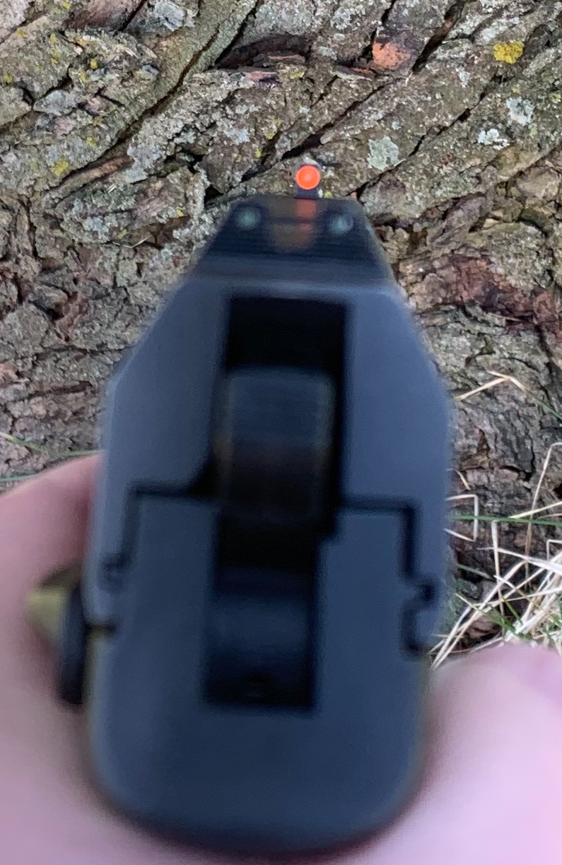 That orange wouldn’t “pop” like that if you, for instance, took it out of a nightstand drawer at zero dark thirty; the orange is luminescent and needs to be “charged”...but it is reflective, as well, so if there’s any light, it shows up (there is also a bright green tritium center on the orange...it’s somewhat visible, sorry for the blurry pics)...and all the charging that sight got was from about a minute or two that I took it outside and got the first photo by the tree.