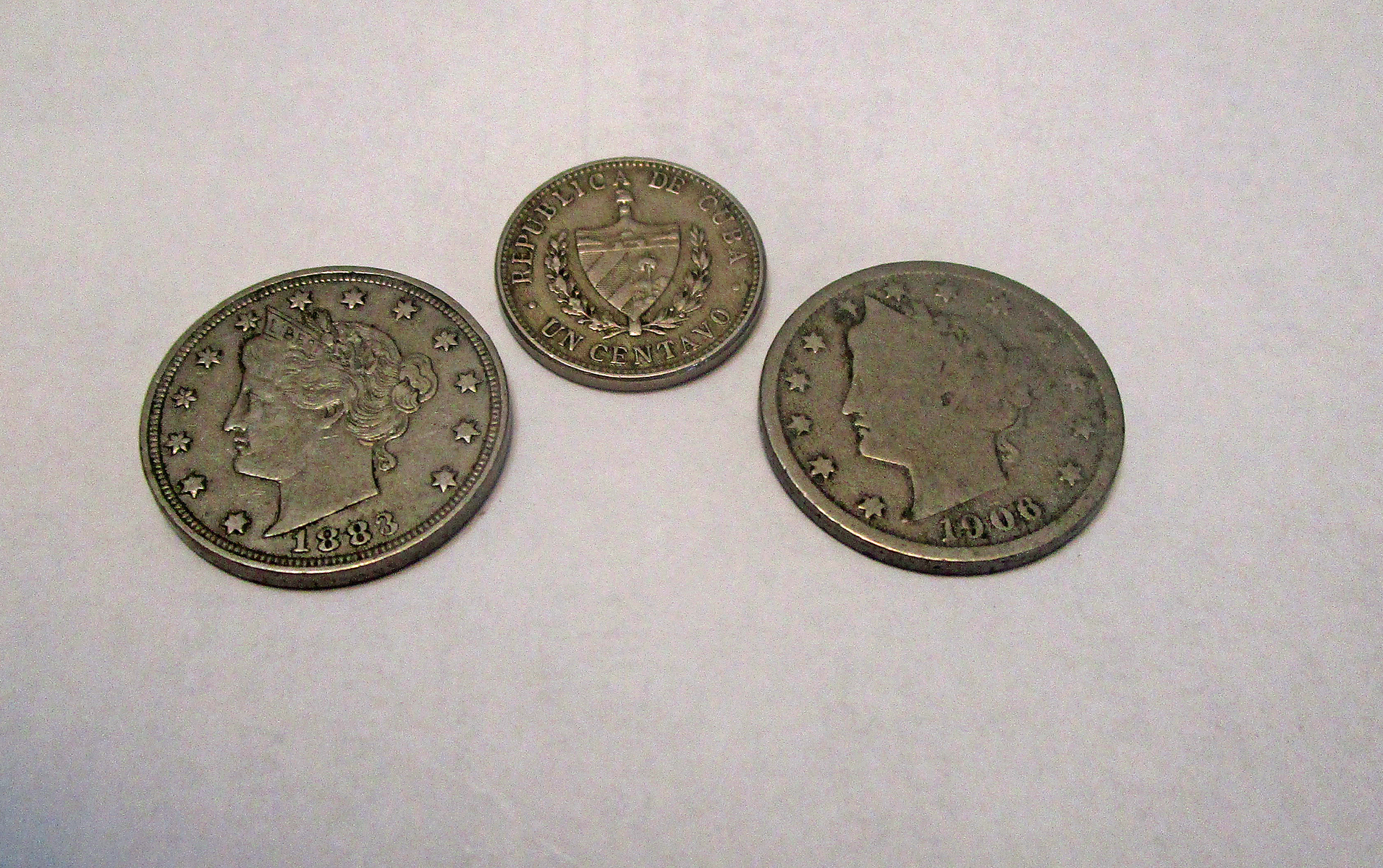 My wife and I recently came back from a road trip. When she did the laundry, she checked my pockets for change and along with what I normally have, she found two old nickels (1883 and 1906) and a one centavos coin from Cuba dated 1946. I wish I knew what convenience store I got those from on our trip. Pretty cool looking coins.