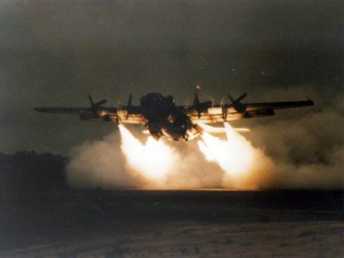 Eight rockets from Shrike anti-radiation missiles were also mounted vertically above the wheel wells to cushion the aircraft’s descent as it dropped almost vertically to land. Four more Shrike rocket motors were mounted under the wings to help control the C-130’s yaw during the rapid takeoff.