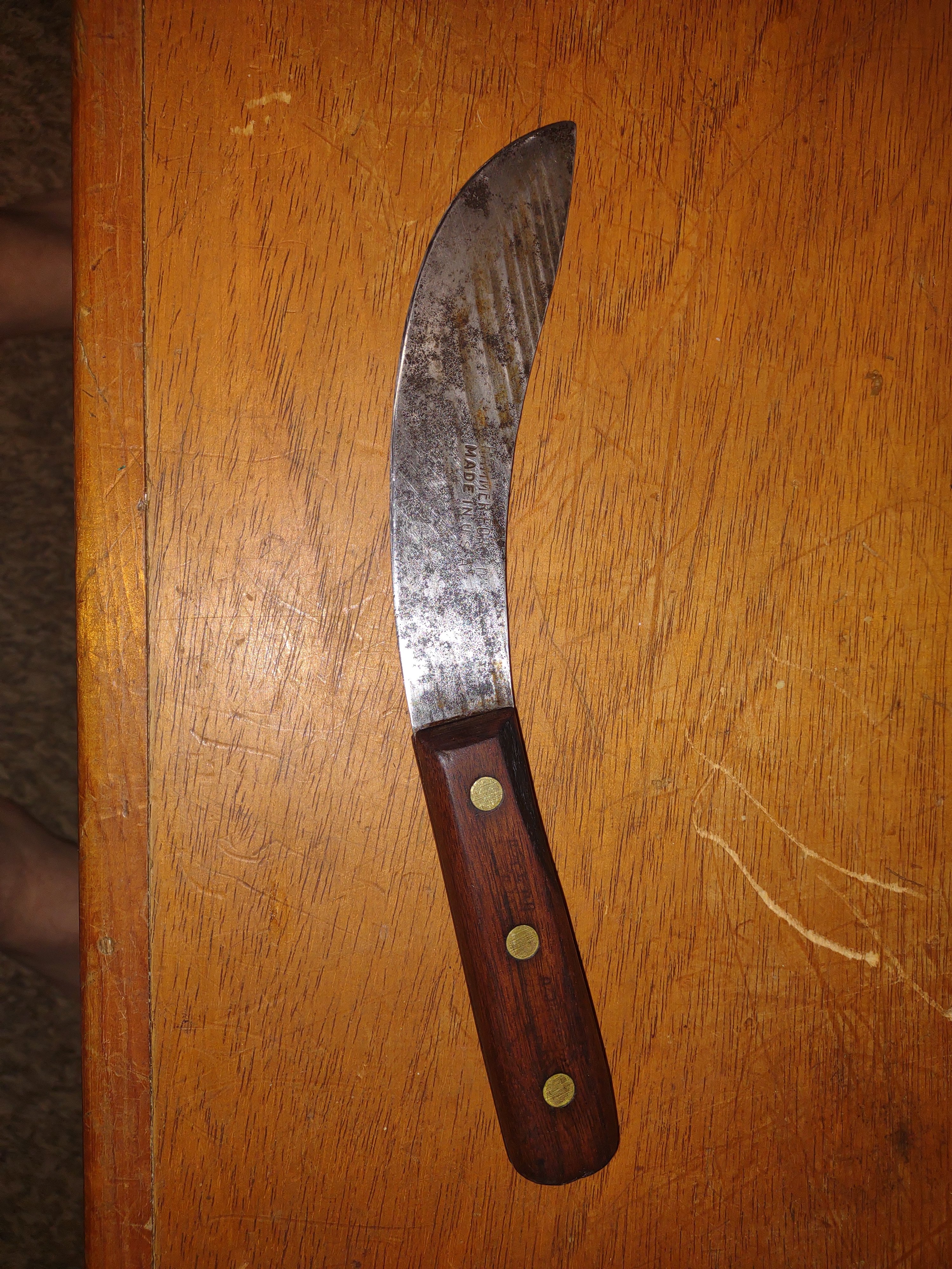 I was thinking perhaps Old Hickory, it has the same blade decoration/marks as thiersDoesn't say. It's made in the USA and says "HAMMER FORGED". Near as I can tell, older Old Hickory based on the Green River blades. Had fun sharpening and shaving hair with it. Cuts meat really well from my experience in the kitchen. I may polish it and then give it a mustard patina