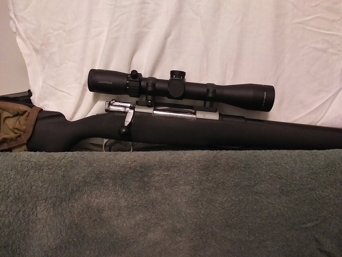 4 power Bushnell scope, Leupold base and rings, unknown maker composite stock, and Multicam sling.