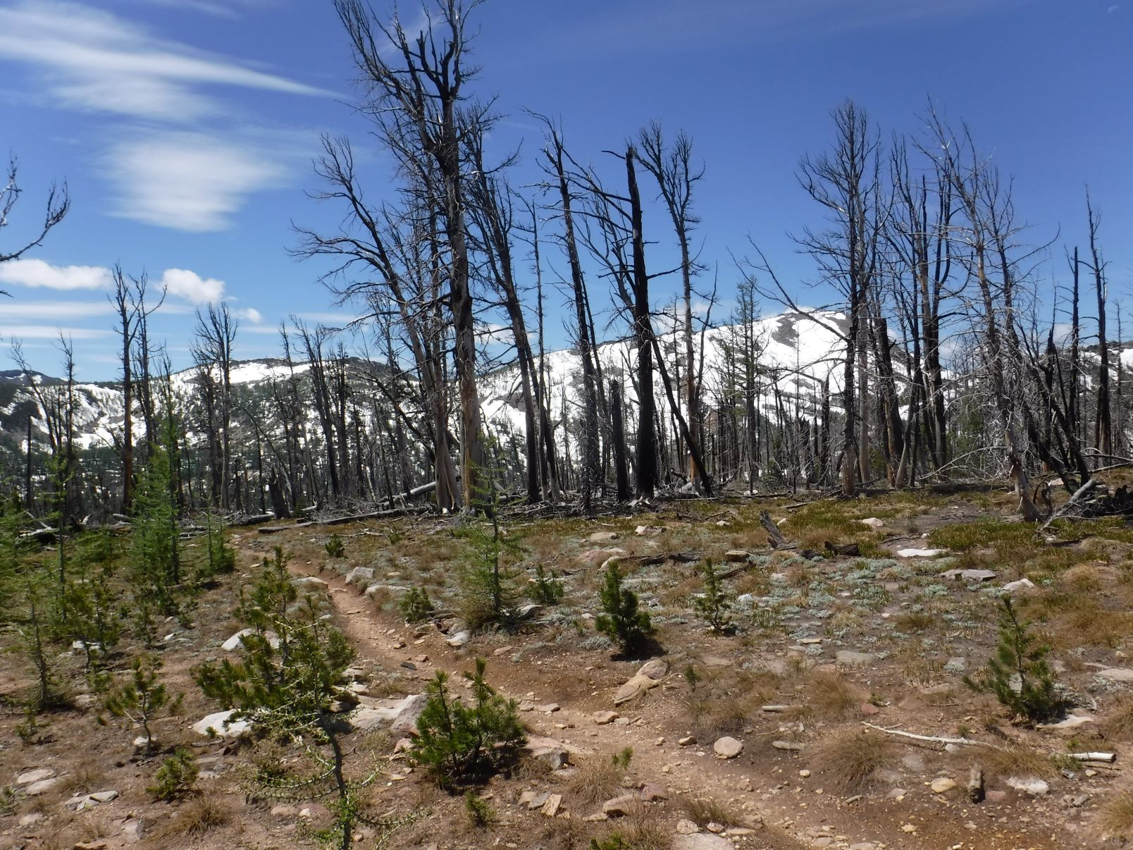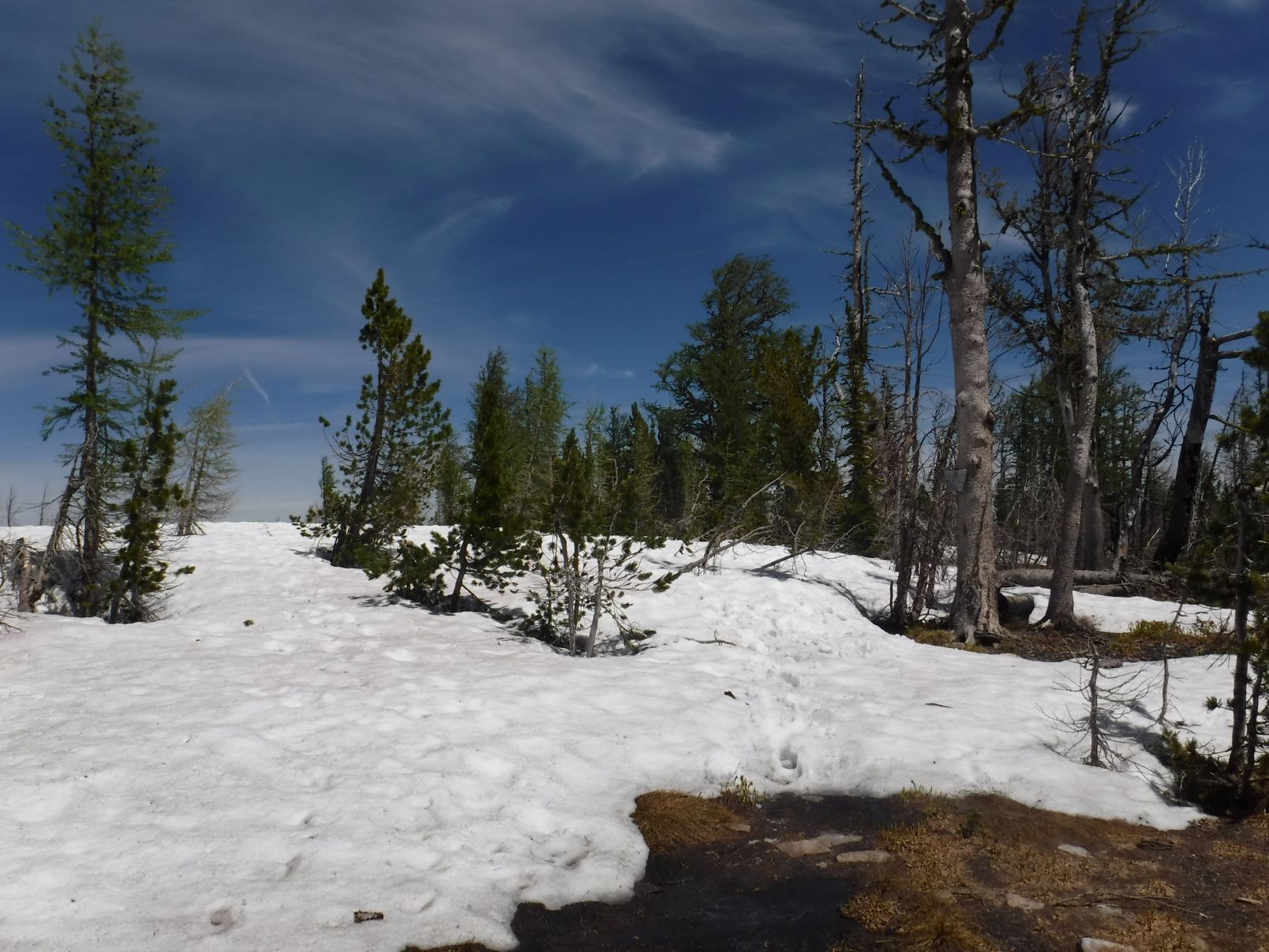 Ran into the remnant snow banks ~200 ft. below the saddle. The snow was deep & rotten and covering the trail for a distance so I bypassed two biggest fields walking along the edges in the melted off open parts. Finally got up on the saddle near the view point where I was heading.