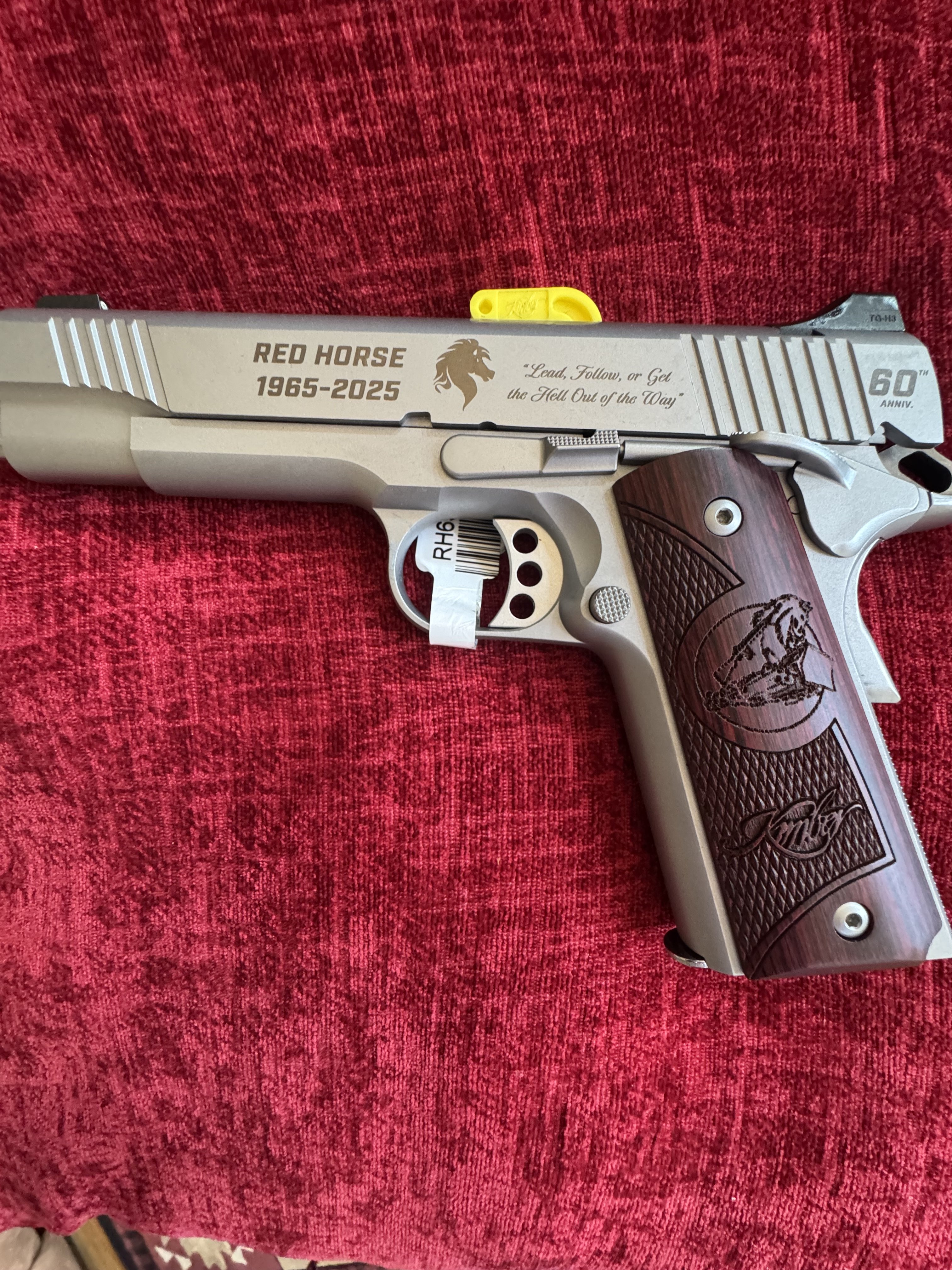 He is collecting military special edition Kimbers. Apparently Kimber does this from time to time. This one is the husband’s second Red Horse special edition. Only one side though, as the other side has way too much information on the slide.